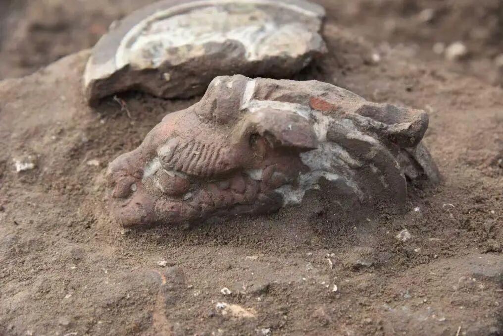 据了解,今年度发掘出土遗物主要出自基址上的倒塌堆积,出土遗物多为建树材料,包括陶板瓦、筒瓦、瓦当、滴水、脊兽、砖,以及石螭首、雕栏构件等。陶建树材料多有琉璃器,以绿色琉璃为多。瓦当、滴水纹饰以龙纹为主,凤纹为次。其他遗物中可见多数残塑件,应是建树或佛像上的掩饰品。