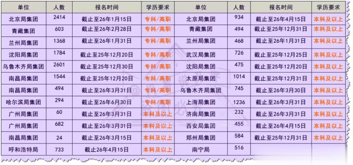 岗亭边界:总招录 20480 东谈主,分专科、本科两个批次,专科批次仍有 7 家单元可报(北京局、青藏集团、兰州局等),本科批次报名单元更多(武汉局、上海局、广州局等)。