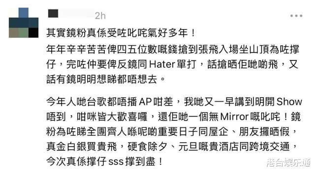 一位粉丝指摘称:“其实镜粉(MIRROR粉丝)受《怒斥》的气好多年了!每年为了解救偶像,辛贫寒苦出四位数、五位数的价钱抢门票,坐在‘山顶位’,成果完场后还要被黑粉、其他歌手粉丝袭击,说咱们把他们的票抢了,又说蓝本想去但看到MIRROR就不想去了!本年商台MIRROR的歌都不何如播,名次这样差,咱们又早就说了MIRROR要开Show,不会去,这不是皆大兴盛吗?还他们一个莫得MIRROR的《怒斥》!”